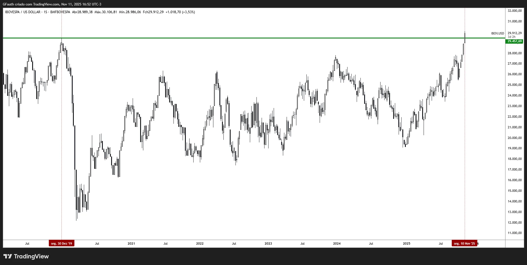 Mesmo com incertezas fiscais e a proximidade das eleições de 2026, o investidor estrangeiro percebe que o Banco Central brasileiro está jogando no campo da credibilidade. Gabriel Galípolo manteve o tom cauteloso, mas transmitiu uma mensagem de confiança: a inflação está cedendo e o pior já passou. A perspectiva de estabilidade política até o ciclo eleitoral, somada à queda gradual das expectativas de inflação, reforça a atratividade da Bolsa em dólares, que está em seu melhor momendo desde dezembro de 2019: