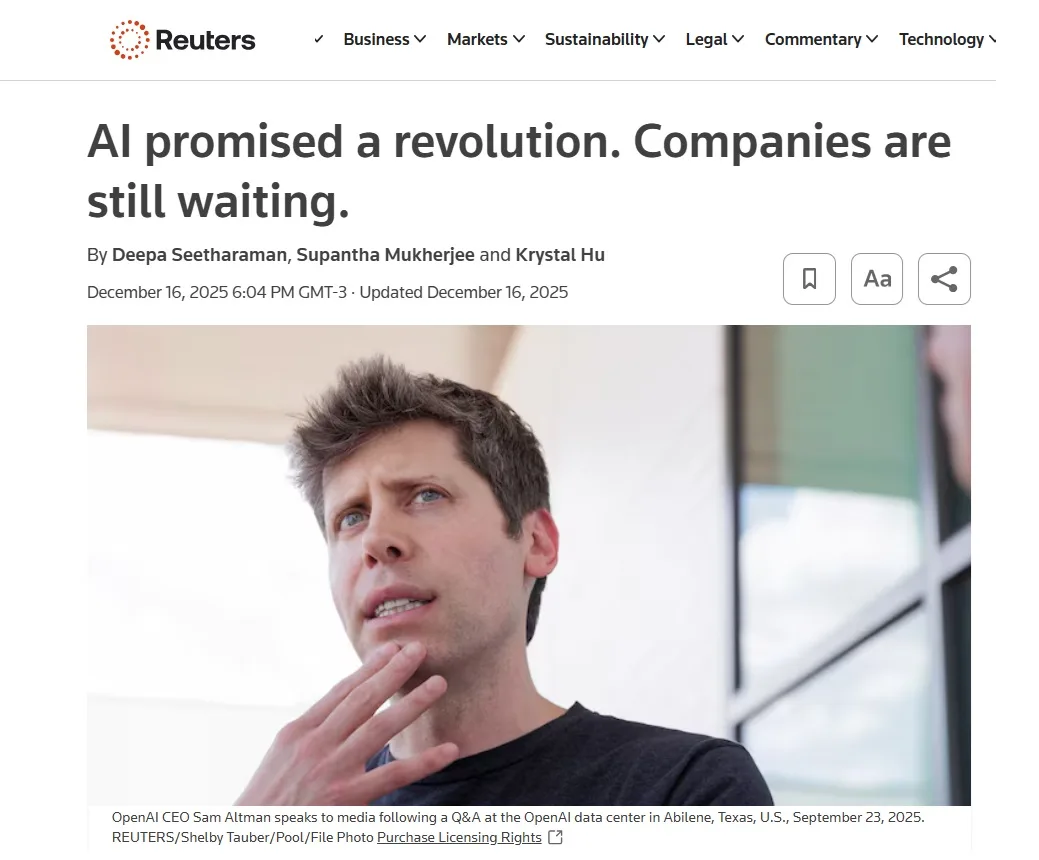 Três anos após o lançamento explosivo do ChatGPT, as empresas ainda lutam para extrair valor real da Inteligência Artificial generativa, revelam pesquisas e relatos de executivos, de acordo com reportagem da Reuters. Uma sondagem da Forrester com 1.576 líderes empresariais no segundo trimestre indicou que apenas 15% registraram melhora nas margens de lucro graças à IA. Já a BCG, ao consultar 1.250 executivos entre maio e julho, concluiu que só 5% perceberam benefícios generalizados.