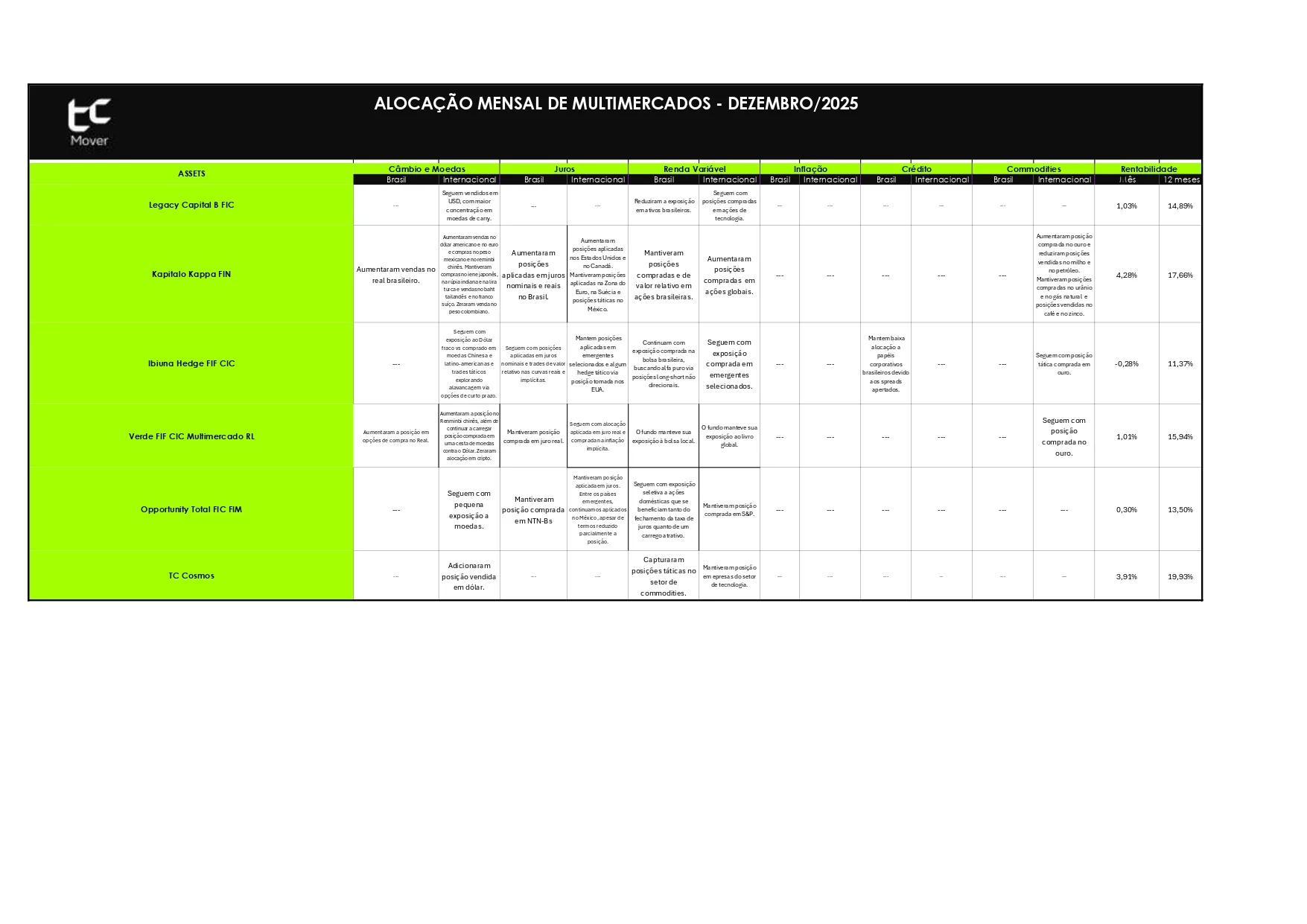 São Paulo, 20/01/2026 – Confira na tabela abaixo a alocação de alguns dos principais fundos de investimento multimercados do Brasil em dezembro. Entenda as posições de cada gestora em mercados de ações, câmbio, renda variável, crédito e etc.
