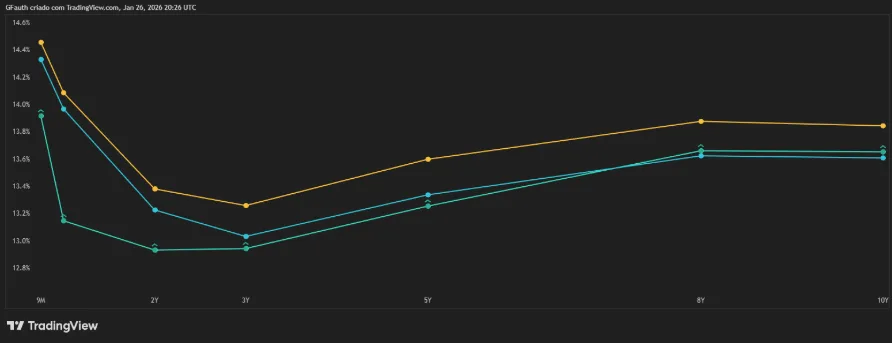 Apesar da perda de inclinação da curva de juros e a resposta positiva nas ações, vemos que ainda falta muito até que os juros alcancem o patamar de 1 mês atrás: