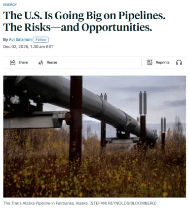 A América do Norte vive o maior ciclo de expansão de gasodutos da história: empresas preveem investir US$53 bilhões só em 2025 em projetos de crescimento (recorde acima dos US$49 bi de 2019), segundo dados do Wells Fargo citados por Parag Sanghani, da Westwood Group, e compilados pela Barron’s nesta semana. O dinheiro está indo principalmente para (i) levar gás natural ao Golfo do México para alimentar os novos terminais de Gás natural liquefeito que exportam para Europa e Ásia, (ii) conectar usinas termelétricas aos data centers em expansão (ex.: Energy Transfer construindo dutos dedicados para três centros da Oracle no Texas) e (iii) rotas canadenses de exportação para a Ásia.